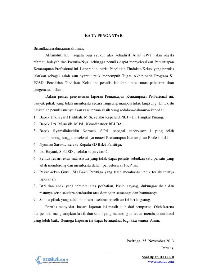 Aug 13, 2021 · contoh kata pengantar laporan pkp ut pgsd 2015 kata pengantar sebagai rasa syukur penulis panjatkan kehadirat allah subhanahu wataala karena atas rahmat dan petunjuk yang diberikan sehingga penulis dapat menyajikan laporan hasil perbaikan pembelajaran ini.